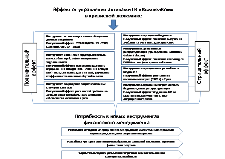 В ходе исследования были проанализированы и систематизированы инструменты финансового менеджмента, используемые корпорацией «ВымпелКом» в условиях динамического роста в кризисной экономике. На их основании был выявлен эффект от управления активами группы компаний «ВымпелКом» в кризисной экономике (Рисунок 2).