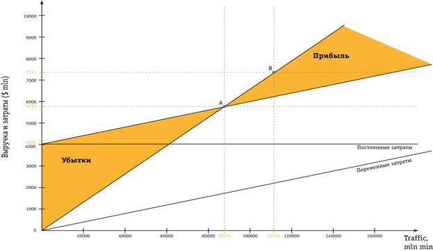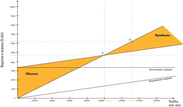 Точка «А» обозначает точку безубыточности, точка «В» отображает уровень выручки и затрат при соответствующем годовом уровне трафика (Рисунок 3, 4).