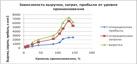 Рисунок 5 отображает зависимость выручки, операционных затрат и операционной прибыли от уровня проникновения за временной отрезок с 2001 по 2009 год включительно. После 100% порога проникновения абсолютные значения выручки, затрат и операционной прибыли демонстрируют больший прирост по сравнению с отрезком от 0 до 100% проникновения.
