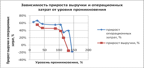 Рисунок 6 - Зависимость прироста выручки и операционных затрат от уровня проникновения (авторская разработка)
