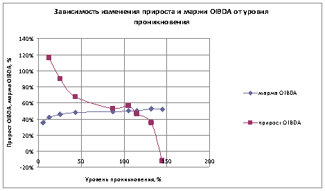В рассматриваемой высокотехнологичной телекоммуникационной отрасли, критерием целесообразности осуществления затрат является, по мнению автора, уровень проникновения, который означает степень использования потребителями конкретной услуги, сервиса или высокотехнологичного продукта и определяется путем деления количества единиц сервиса в пользовании потребителей на общее количество потенциальных потребителей сервиса в отдельно взятом географическом рыночном сегменте. Таким образом, уровень проникновения услуги характеризует с одной стороны востребованность сервиса у потребителей, с другой – является индикатором уровня конкуренции в определенном рыночном сегменте и, соответственно, напрямую связан с потенциальными возможностями прироста выручки, операционной прибыли и OIBDA.