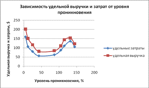 Рисунок 8 - Зависимость изменения удельной выручки и затрат от уровня проникновения (авторская разработка)