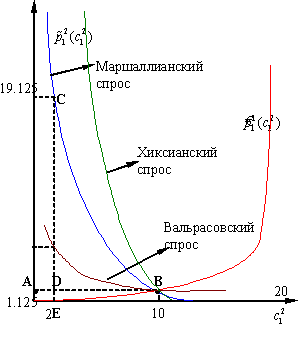 . На следующем рисунке мы представляем все три определённых нами выше функции спроса для нашего примера Маршаллианской траектории. Хиксианская функция валового спроса определена здесь для кривой безразличия второго потребителя, проходящей через Вальрасовское равновесное распределение. Вальрасовская функция спроса определена для начального распределения