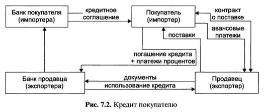 Особенность кредита покупателю заключается в том, что банк экспортера непосредственно кредитует не национального экспортера, а иностранного покупателя, т. е. фирмы страны-импортера и их банки. Тем самым импортер приобретает необходимые товары, оплачивая их за счет кредита банка экспортера. Обычно такие кредиты связываются с приобретением товаров и услуг у определенной фирмы. При этом экспортер не участвует в кредитовании сделки, что исключает возможность завышения цены. Стоимость банковских кредитов покупателю, как правило, ниже стоимости заемных средств на рынке ссудных капиталов. Срок кредита покупателю превышает срок кредита поставщику; в основном это средне-и долгосрочные ссуды. Банки при этом могут открывать кредитные линии для иностранных заемщиков на оплату закупленных товаров. Банковские кредиты покупателю оттесняют кредиты поставщику (экспортеру) и фирменные кредиты.
