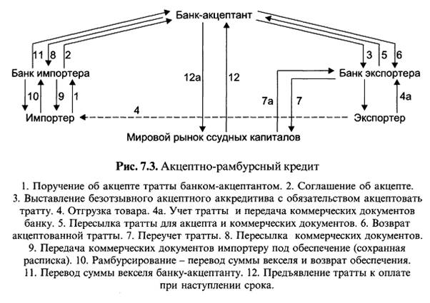 Одной из форм кредитования экспорта является акцептно-рамбур - сный кредит, основанный на сочетании акцепта векселей экспортера банком третьей страны и перевода (рамбурсирования) суммы векселя импортером банку-акцептанту.