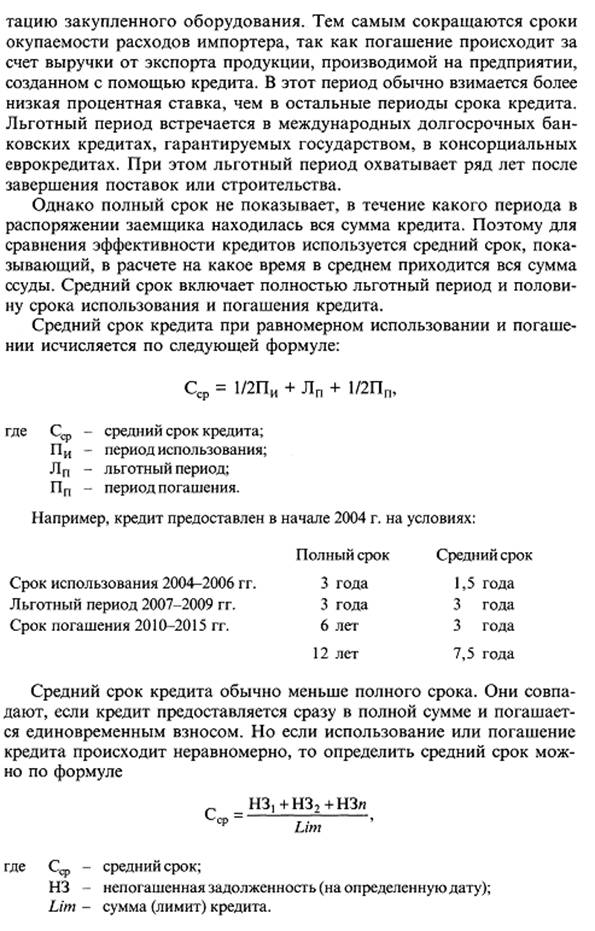 Срок международного кредита зависит от ряда факторов: целевого назначения кредита; соотношения спроса и предложения аналогичных кредитов; размера контракта; национального законодательства; традиционной практики кредитования; межгосударственных соглашений. Срок кредита - важное средство конкурентной борьбы на мировых рынках. Для определения эффективности кредита различаются полный и средний сроки.