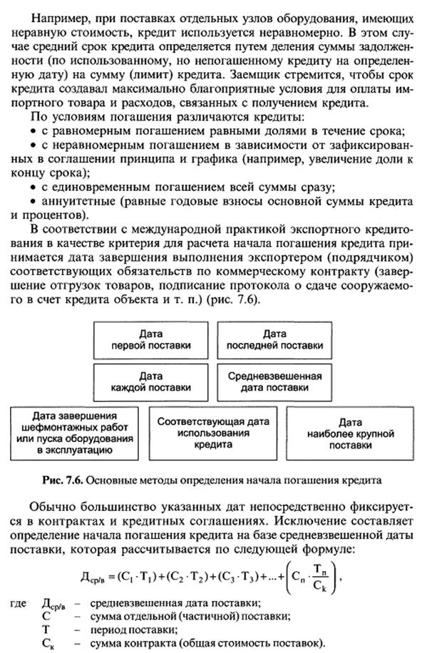 В отличие от банковского кредита период использования фирменного кредита совпадает со сроком поставки товара по контракту. При этом началом полного срока служит дата акцепта покупателем тратт, выставленных экспортером после поставки последней партии товара, т. е. после выполнения экспортером контрактных обязательств. Льготный период кредита особо важен при коммерческих сделках, поставках комплектного оборудования, поскольку в этом случае начало его погашения по возможности приближается к моменту ввода в эксплуа