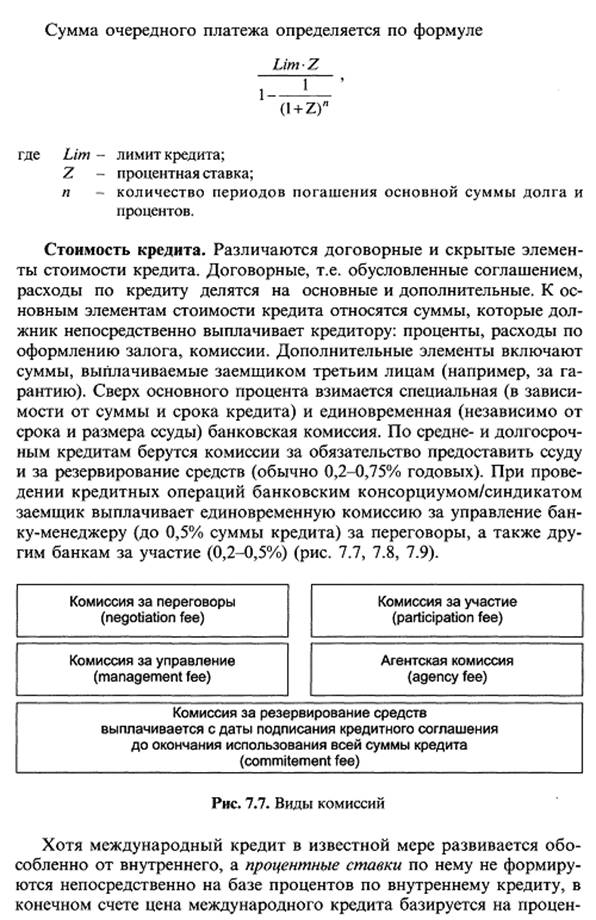 4) при предоставлении международных займов в форме выпуска ценных бумаг традиционный консорциальный/синдицированный кредит сочетается с андеррайтингом - гарантированием их размещения по установленной цене среди банков - членов консорциума или синдиката, взявших это обязательство в определенной доле;