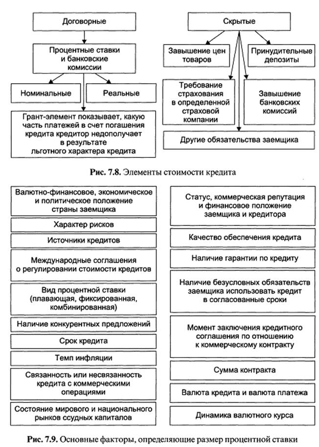 К скрытым элементам стоимости кредита относятся расходы, не упомянутые в соглашении. В их числе завышенные цены товаров по фирменным кредитам; принудительные депозиты в установленном размере от ссуды; требование страхования кредита в определенной страховой компании, связанной с банком; завышение банком комиссий и т. д. Некоторые элементы стоимости кредита не поддаются денежной оценке, хотя значение их велико, например, для установления контроля над иностранной фирмой или страной-заемщиком. Внешне льготные условия некоторых международных кредитов сочетаются с кабальными скрытыми издержками, которые дорого обходятся заемщику.