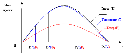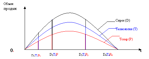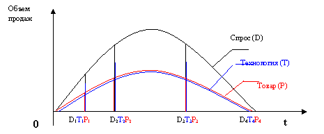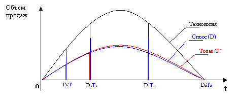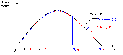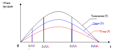 В этом случае кривые жизненных циклов спроса и товара совпадают и расположены под кривой жизненного цикла технологии.