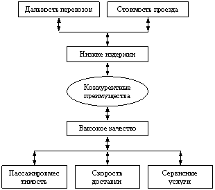 С учетом специфики и условий работы транспортных предприятий в диссертации рассмотрены их конкурентные преимущества: скорость и регулярность доставки пассажиров до пункта назначения, пассажировместимость, дальность перевозок, стоимость проезда, качество, безопасность и транспортная доступность. Отметим, что практически для всех видов транспорта, определяющими являются качественные характеристики, а именно тот вид транспорта, который может обеспечить приемлемый уровень скорости для заданных условий дальности перевозок и стоимости проезда.