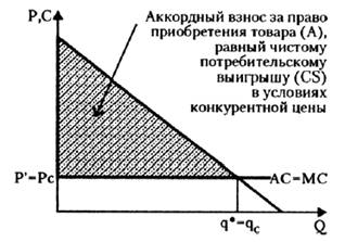 Легко заметить, что уплатив в качестве аккордного взноса за право покупки товара сумму, равную потребительскому излишку при конкурентном ценообразовании, потребитель неизбежно будет приобретать такое же количество товара, какое он приобретал на конкурентном рынке в противном случае его чистый выигрыш – разница между общей полезностью от потребления блага в денежном выражении и уплаченной суммой денег - окажется отрицательной.