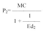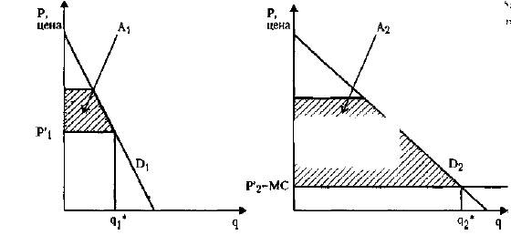 Соответственно, раз функции предельной выручки различны (что определяется по условию различием ценовых предпочтений потребителей и, следовательно, различными функциями совокупного спроса каждого сегмента рынка), цены будут разными в зависимости от ценовой эластичности спроса для каждой группы: