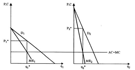 определяться условиями максимизации прибыли: MR1 = MR2=MC.