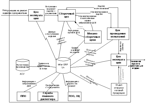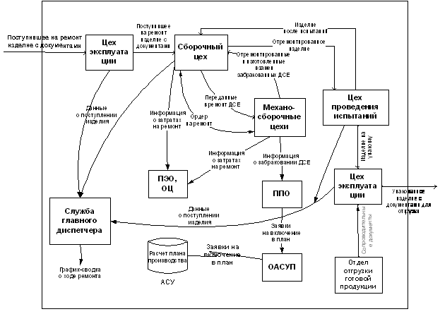 В Приложении 1 представлена схема учета ремонта авиационных двигателей до автоматизации. Как видно на схеме, поступившее на ремонт изделие попадает в цех эксплуатации, где производится его внешний осмотр. Далее – в сборочный цех, где происходит его разборка, дефектация и рассылка узлов по механосборочным цехам. Основным документом, сопровождающим ремонтный узел при рассылке, является «Ордер на ремонт». Этот документ служит для сбора затрат цеха на ремонт узлов с определенного двигателя. Информация о забракованных ДСЕ в виде заявок на включение в план попадает в АСУ расчета плана производства.