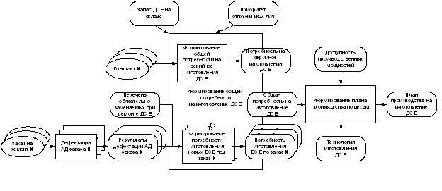 Для детального рассмотрения процессов управления основным и ремонтным производствами необходимо построение моделей (схем) в разрезе функций управления: планирование, учет, контроль и анализ, регулирование, - объединяя единым контуром управления два различных типа производства. В приложении 3 представлена одна из таких схем - схема планирования производства. Она учитывает потребность в изготовлении изделий на серийное производство и на ремонтируемый двигатель.