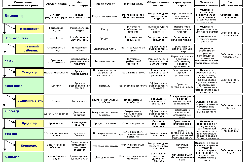 Основные характеристики социально-экономических ролей, связанных с развитием отношений собственности, приведены в таблице.
