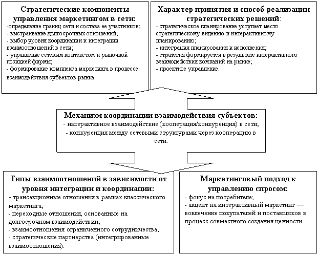 Сетевой подход в промышленном маркетинге является методологией исследования и управления межфирменными отношениями, основанными на социальной и экономической близости партнеров. Межфирменные сети как способ регулирования взаимозависимости между компаниями преодолевают недостатки рыночного и административного механизмов, обеспечивая согласованное принятие решений и сотрудничество при сохранении децентрализованной системы управления.