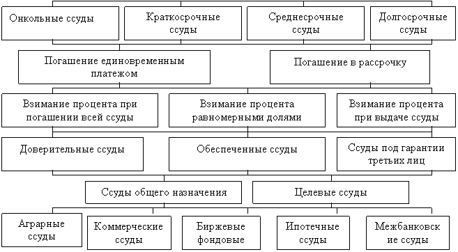 По срокам и способам погашения, по способам взимания ссудного процента, по наличию и видам обеспечения, а также по своему назначению и по категориям заемщиков предоставляемые кредиты могут быть классифицированы так, как это показано на рис.1.
