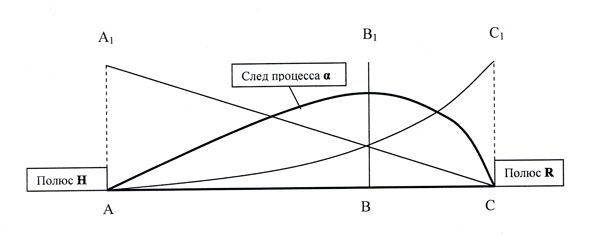 Условно принятые обозначения на схеме следующие. Противоположность (далее сокращенно – пр) Н имеет значение потока энергии, пр R – материальной среды. Зона образования следа α располагается между полюсами Н и R на оси АС, имеющей в общем случае криволинейное очертание. Начальная, потребная для образования следа, порциальная в случае фактографического среза процесса, мощность пр Н показана пунктирной линией A A1, соответствующая мощность пр R – линией СС1. В точке А – начало координат при анализе модели в рамках прямой связи, в точке С – в рамках обратной связи при инверсной смене позиций противоположностей.