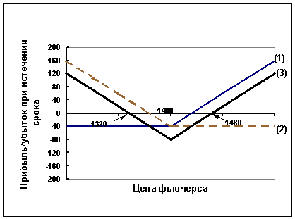 Допустим, в январе инвестор покупает февральский $1400 call-опцион на фьючерс на акции РАО «Газпром» с премией $40 и покупает февральский $1400 put-опцион с премией $40. Общая выплаченная премия составляет $80. Если цена февральского фьючерса установится выше $1480 или ниже $1320, то инвестор имеет возможность получить теоретически неограниченную прибыль. Самая большая сумма, которую инвестор может потерять, составляет $80 в виде уплаченной премии. Это произойдет, если цена на февральский фьючерс останется на уровне $1400.