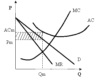 Прибыль максимальна, если при равенстве предельной выручки предельным издержкам, предельная выручка с увеличением выпуска сокращается в большей степени, чем предельные издержки. В условиях максимизации прибыли монополистом предельные издержки, в отличие от модели рынка совершенной конкуренции, могут убывать. Монополист может, максимизируя прибыль, отказаться от повышения выпуска, даже если предельные и средние издержки производства снижаются. Это, как известно, служит одним из аргументов в пользу тезиса о производственной неэффективности монополии.