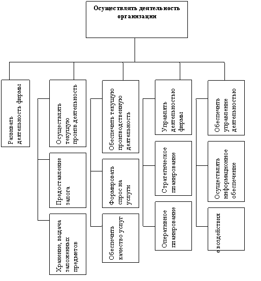 В свою очередь бизнес-процессы реализуют бизнес-функции предприятия. Под бизнес-функцией понимают вид деятельности предприятия. Множество бизнес-функций представляют собой иерархическую декомпозицию функциональной деятельности предприятия. На рисунке 4.2 представлен пример «дерева функций» предлагаемый для на Банковском».