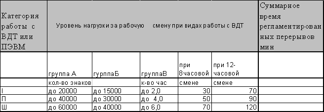 В таблице 6.5 представлены сведения о регламентированных перерывах, которые необходимо делать при работе на компьютере, в зависимости от продолжительности рабочей смены, видов и категорий трудовой деятельности с ВДТ (видеодисплейный терминал) и ПЭВМ (в соответствии с СанПиН 2.«Гигиенические требования к видеодисплейным терминалам, персональным электронно-вычислительным машинам и организации работ»).