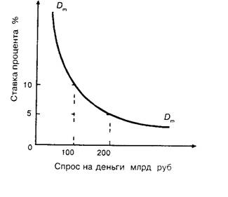 Кривая общего спроса на деньги Dm обозначает общее количество денег, которое население и фирмы хотят иметь для сделок приобретения акции и облигаций при каждой возможной величине процентной ставки.