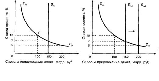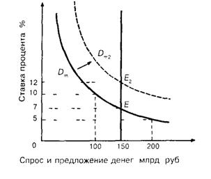 А сейчас попробуем оценить влияние изменений, возникающих в предложении или спросе на деньги. Сначала рассмотрим реакцию денежного рынка на изменение денежного предложения. Допустим, предложение денег увеличилось с 150 до 200 млрд. руб. (рис. ).
