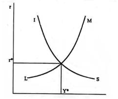 Таким образом, пересечение кривых IS и LM, помещенных на один график, где абсцисса — объем производства, объем национального дохода Y, а ордината — реальная ставка процента R, выявляет точку макроэкономического равновесия как результат условий, складывающихся и на товарном, и на денежном рынках. Отношение это крайне упрощено, ибо не учитывает внутренние причины создания таких условий, а также вероятностный характер монетарной системы.