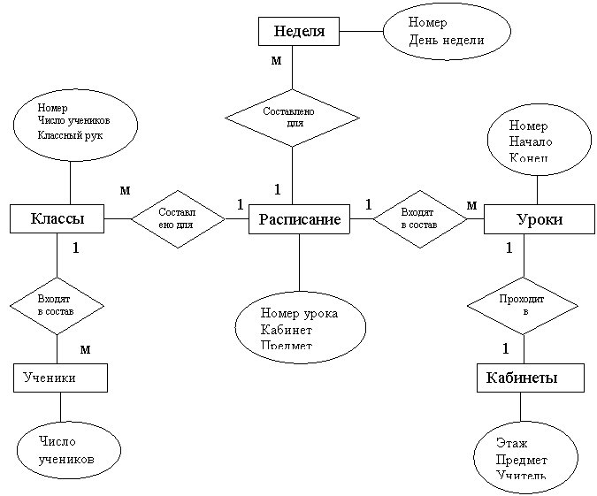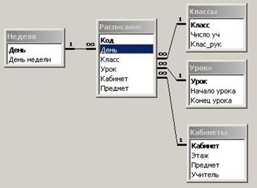 В результате на поле окна Схема данных появятся образы 5 таблиц. Нажав левую клавишу мыши, перетащить ключевое поле Класс таблицы Расписание на поле Класс из таблицы Моя подгруппа. Откроется окно Связи. Последовательно активизировать флажки «Обеспечить целостность данных», «Каскадное обновление связанных полей», «Каскадное удаление связанных записей». Тип связи «Один ко многим» будет выбран автоматически.