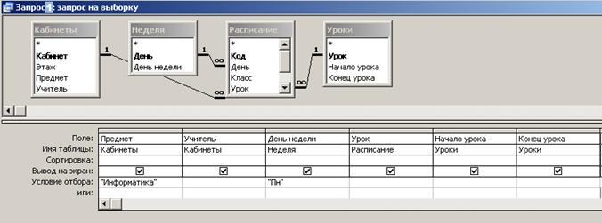 Для создания запроса необходимо открыть основное окно базы данных и выбрать пункт “Запросы” - Создание запроса в режиме конструктора. Появится окно диалога “Добавление таблицы”, в котором необходимо выбрать таблицы, которые будут использоваться для запроса (в нашем случае – таблицы Неделя, Расписание, Классы, Уроки, Кабинеты). Меню - Вид – Объекты БД.