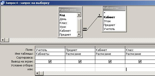 Открывается окно “Запрос1: запрос на выборку”, где в верхней части представлены таблицы, используемые для запроса (ключевые поля выделены жирным шрифтом), а в нижней – конструктор запроса.