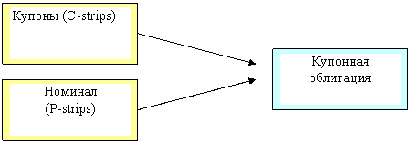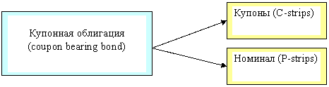 В течение последних 20 лет наблюдался бум финансовых инноваций на мировом рынке. Программа STRIPS, появившаяся в начале 80-х годов прошлого века, является продуктом финансового инжиниринга в области управления долговым капиталом. Стрипование – процесс разделения обычной купонной облигации на составные части: купоны и номинал, т. е. долговая ценная бумага превращается в портфель множества краткосрочных и одной долгосрочной облигации (рис.2). Как правило, финансовые инновации рождаются на рынке, где возникают разного рода ограничения, обусловленные растущими трансакционными издержками, наличием риска рефинансирования и необходимостью поддержания определенного уровня ликвидности на соответствующем рынке. Купоны торгуются и хранятся как отдельные бескупонные долговые инструменты; их срок обращения равен периоду между купонными выплатами. В результате стрипования купонной облигации со сроком обращения 10 лет и выплатой купона раз в полгода на рынке появятся 20 краткосрочных облигаций (C-strips) и одна долгосрочная (P-strips), равная номиналу этой ценной бумаги, т. е. облигация с нулевым купоном (zero-coupon bonds).
