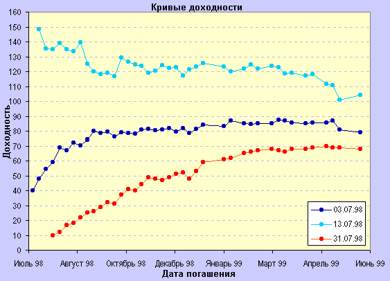 Существуют и другие факторы, влияющие на форму кривой доходности, такие как особенности налогообложения различных потоков платежей по облигациям, требования регулирующих органов к структуре активов институциональных инвесторов в облигации (пенсионных фондов, страховых компаний, инвестиционных фондов), структура внутреннего и внешнего государственного долга и график его погашения, ожидание какого-либо значимого для рынка облигаций события и другие. Известно, что в середине июля 1998 года, непосредственно перед завершением переговоров с МВФ о получении «стабилизационного» кредита на сумму $4,9 млрд, многие инвесторы в ожидании благополучного завершения переговоров перешли с «короткого» конца кривой доходности на «длинный», т. е. продали ГКБО со сроком до погашения 1–1,5 месяца и купили ГКБО со сроком до погашения 11–11,5 месяцев, рассчитывая получить дополнительную прибыль за счет более высокой дюрации «длинных» ГКБО в условиях прогнозируемого общерыночного падения доходности.