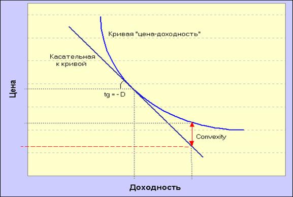 Поскольку кривая цена/доходность выпукла (что означает непрерывное изменение ее наклона, рис. 6), вводится расчёт показателя выпуклости (convexity, Cx), являющегося квадратичным приближением ценового риска и представляющего собой вторую производную цены облигации по доходности : V=1/2 х (¶ ²P / ¶ Y²) / P.