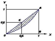 «Кривая Лоренса» - метод графического изображения уровня концентраций явлений. Для расчета конкретного уровня неравенства распределении уровня доходов поступают следующим образом, площадь, образованную линиями равномерного и неравномерного распределения доходов (она на графике заштрихована), относят к площади треугольника OAB. Полученный результат и есть «коэффициент Джени».