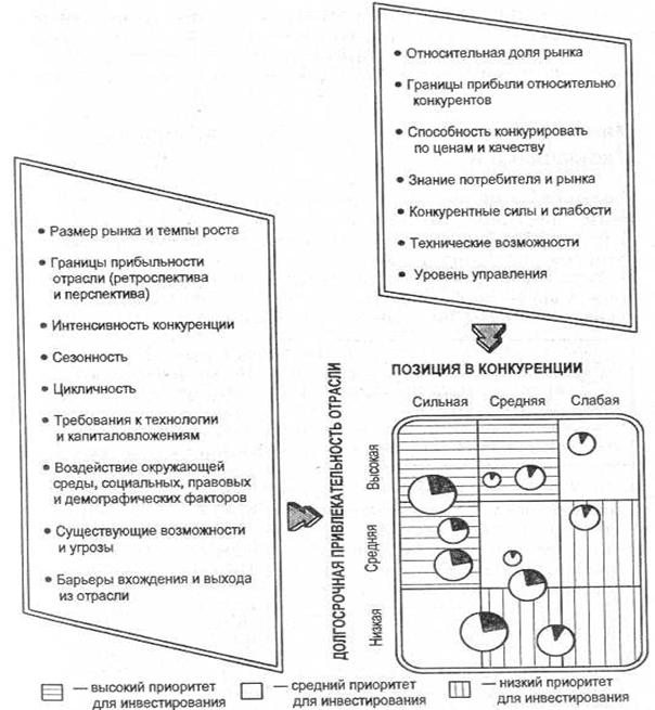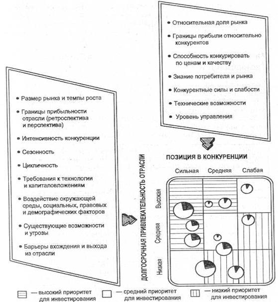 Матрица GE делится на три зоны. Секторы в верхнем углу представляют собой устойчивые СБЕ, в которые компания должна вкладывать средства, чтобы развиваться. Квадраты по диагонали содержат СБЕ со средним уровнем общей привлекательности. Три сектора в нижнем правом углу матрицы отведены под стратегические бизнес-еденицы, которые обладают низкой общей привлекательностью. Компании следует изъять средства из данных СБЕ. Кружки соответствуют четырем СБЕ компании которые ведут конкурентную борьбу. Секторы в каждом кружке представляют долю рынка, занимаемую каждой СБе. Сравнив текущую и будущую матрицы бизнес-портфелей компании, рук-во сумеет определить основные стратегические проблемы и возможности в будущем компании. Одна из целей портфельного анализа- не допустить инвестирования в СБЕ, которые хотя и работают на привлекательных рынках, но не обладают там прочной позицией.