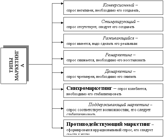 Уровень спроса на продукцию компании должен быть таким, какой желателен для нее. Компания может столкнуться со значительными колебаниями спроса: он может упасть до нуля или вырасти очень сильно, стать нерегулярным и т. п. Управление маркетингом как раз призвано разработать схемы действия компании при разных уровнях спроса на ее продукцию. При этом управление маркетингом может быть направлено не только на рост спроса, но и на его корректировку и даже снижение.