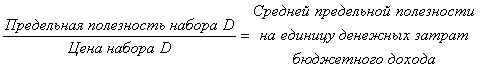 Согласно количественной теории потребительского поведения (кардиналистский подход), рациональный потребитель (покупатель) при имеющемся у него бюджетном ограничении будет максимизировать совокупную полезность, распределяя свой доход так, чтобы соотношения предельных полезностей потребляемых им товаров в расчете на цену этих товаров были равны.