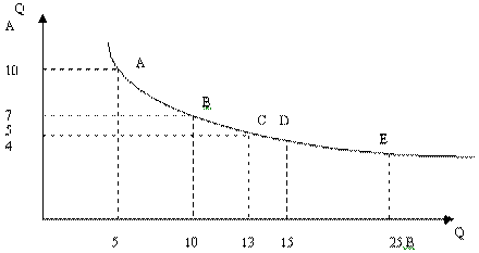 Как видно из графика, Ивановы могут приобрести 10 единиц товара А и 5 единиц товара В. Уменьшив до 7 единиц товара А, они должны возместить снижение уровня удовлетворения потребностей приобретением 10 единиц товара В, чему соответствует перемещение кривой из точки А в точку В. При этом полезность, приносимая первыми единицами товара В, будет намного выше полезности, теряемой вследствие уменьшения последних единиц товара А. Это вытекает из закона убывания предельной полезности. Снижение объема товара А на 3 единицы компенсируется увеличением товара В на 5 единиц. Дальнейшее уменьшение товара А потребует более значительного увеличения товара В в приобретаемом наборе. А это, между прочим, свидетельствует о том, что при движении в точку Е полезность единицы убывающего товара А увеличивается, а полезность единицы возрастающего товара В уменьшается. Таким образом, каждый из точек кривой АВСDЕ соответствует одна и та же суммарная полезность набора товаров А и В. Ивановым безразлично, какой именно набор выбрать, так как все они дают одинаковое удовлетворение потребностей.