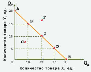 . Покупатель не может себе позволить приобрести набор товаров, обозначенный точками, расположенными выше и правее бюджетной линии (точка F), так как такой набор потребовал бы большего дохода. Точка, находящаяся внутри бюджетной линии (точка G), также означает доступность набора товара для потребителя, но, приобретая такой набор, потребитель не полностью использует свой доход, т. е. ему доступны наборы, содержащие больше и товара