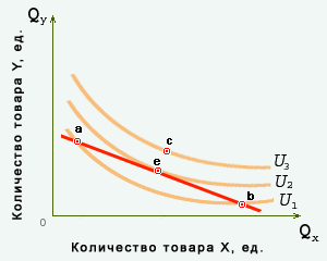 На рис. 7 потребитель находится в состоянии равновесия в точке е, т. е. он максимизирует совокупную полезность при заданном бюджетном ограничении, приобретая набор товаров, соответствующий координатам точки е. Точки а и b на кривой безразличия