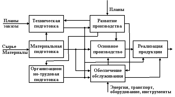 Под производственным процессом (ПП) понимают совокупность технологических процессов, связанных между собой материальными, энергетическими и информационными потоками и осуществляемых для производства конечного продукта из исходного сырья. Существует большое разнообразие производственных процессов, различающихся видом используемой энергии, оборудованием, организацией, но все они должны реализовываться в соответствии с определенными правилами и нормами. Осуществление любого производственного процесса требует выполнения действий по управлению.