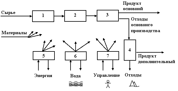 4 – санитарная очистка и утилизация отходов; 5 – энергетическая система; 6 – подготовка вспомогательных материалов и водоподготовка; 7 – система управления