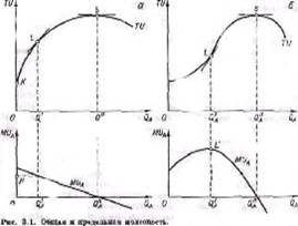 Принцип убывающей предельной полезности не универсален, т. е. нельзя говорить, что всегда предельная полезность сразу убывает. Во многих случаях предельная полезность последующих единиц блага сначала увеличивается, достигает максимума и лишь затем начинает снижаться. Такая зависимость характерна для небольших порций делимых благ. (см. рис 3.1, вторая половина). На этом графике 1-ый закон Госсена начинает выполняться только после достижения точки Q'a.