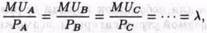 Доказательство: предположим, что А и В реально покупаемые блага. Однако пусть MUa/Pa > MUb/Pb. В данной ситуации потребитель не достигает оптимума удовлетворения, т. к. он может сократить потребление блага В и увеличить потребление блага А, что принесет ему большую общую полезность. Данное перераспределение объема потребляемых благ будет происходить до тех пор, пока не начнет выполняться соотношение (1). Аналогично объясняется соотношение (2).