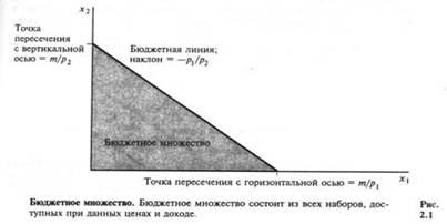 Бюджетное множество представляет собой множество потребительских наборов, доступных потребителю при данном уровне цен и данном располагаемом доходе. Вальрасианское (конкурентное) бюджетное множество: