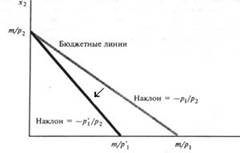 · при увеличении цены товара 1 бюджетная линии становится круче, т. к. теперь потребитель может приобрести меньшее количество блага 1 (см. рисунок на правой стороне листа)